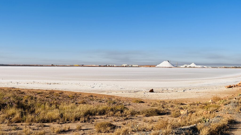 Leaving Port Hedland we drove by these huge salt fields. The white mountain in the background is salt being piled up for further transport. Most of the Port Hedland salt is used in the chemical industry.