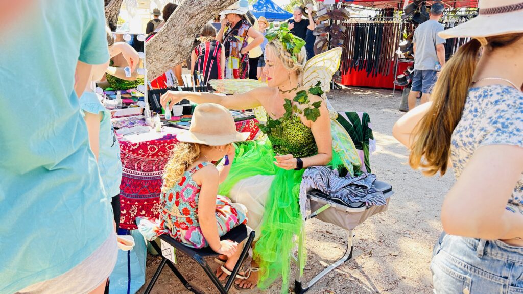 But before we started repacking we went to the Broome Courthouse Market. On this market this lovely fairy was painting glitter tattoos for kids. Isn’t she wonderful?