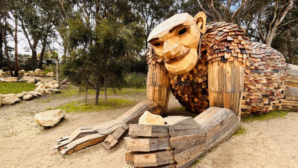 We stopped in Mandurah again for another one of Thomas Dambo‘s Giants and arrived at the location of „Yaburgrt Winjan Cirkelstone“ just as the rain took a short break.