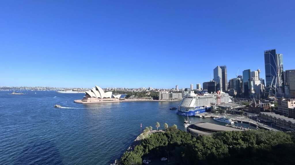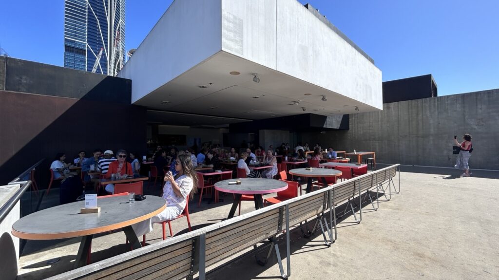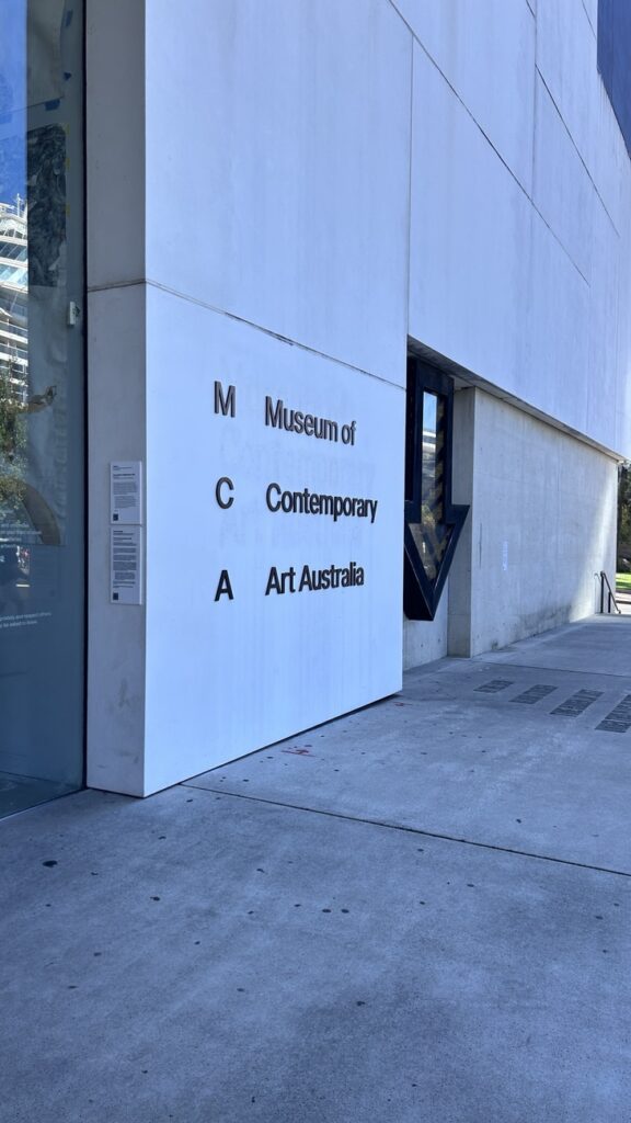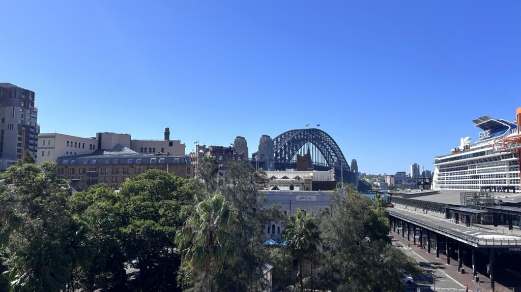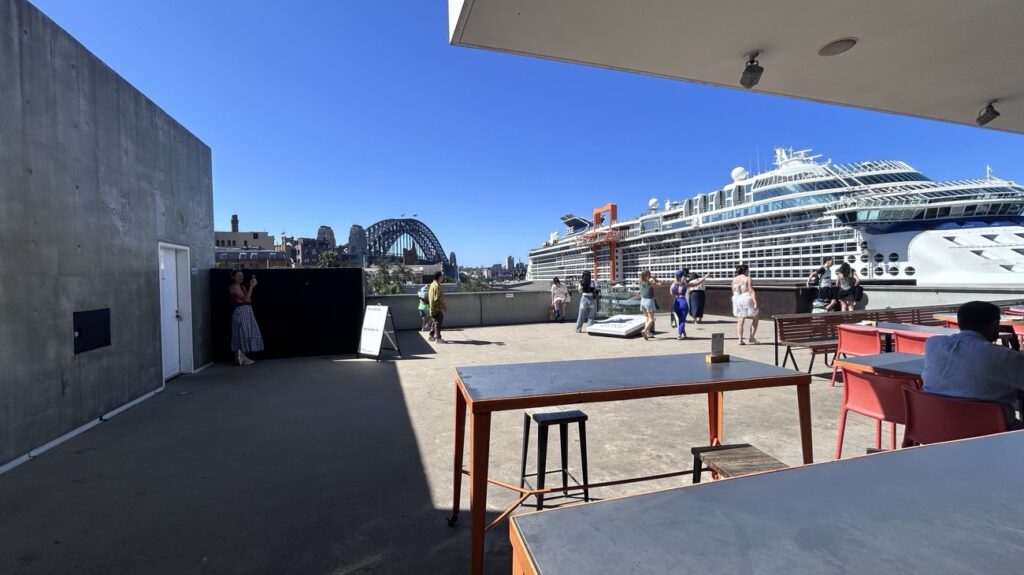 When you keep on straight you end up at Sydney harbour where we had lunch at the Museum of Contemporary Arts. The museum´s roof top cafe offers not only delicious food but also a beautiful view over the Harbour Bridge. Unfortunately we couldn‘t see the Opera House from the terrace as a gigantic cruise ship was docked in the harbour blocking the view.