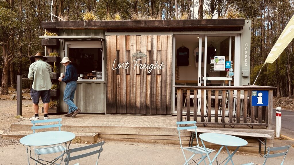 On our way down we stopped halfway at the lovely “Lost Freight Cafe”, a shipping container turned coffee shop at 740m above sea level. When we chatted a bit while getting our „long blacks“ we learned that they were expecting snow for the next day down to about 800 meters. Close to the cafe the only snow plow in Tasmania is waiting to be put to good use already in fall (March).