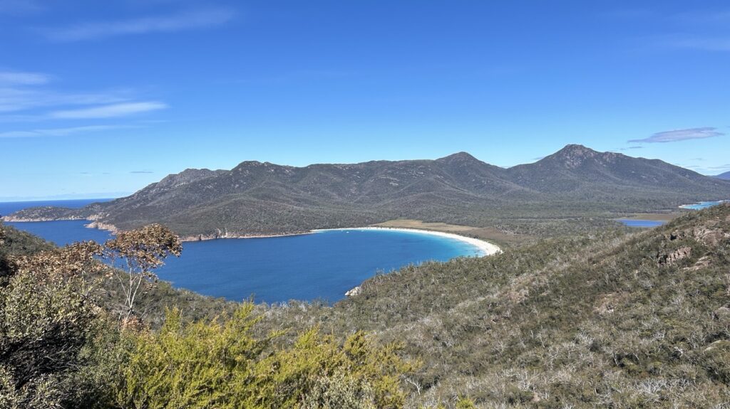 Originally we wanted to do the whole Wineglass Bay hike, meaning a hike up to the lookout and then down to the beach. But spontaneously decided against it. We did the ascent only to this magnificent view. Apparently the bay looks like a wineglass with a small stem leading into it. If they say so.