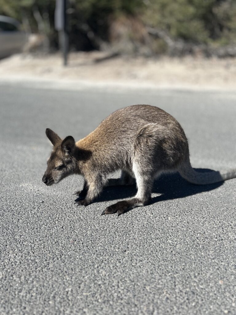 In the parking lot this little beauty sat on the asphalt between the cars. We had seen many Wallabys on this trip but none this close.