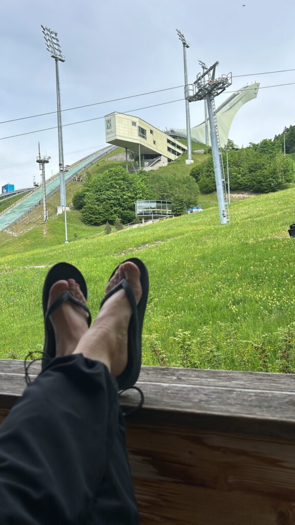 Starting point for the Partnach Gorge (Partnachklamm) is the parking lot of the ski jump at the Olympic Stadion in Garmisch. As we had booked ourselves into the Partnach Lodge next door, however, we had the benefit of not only free parking but also this incredible view from the balcony of our apartment.