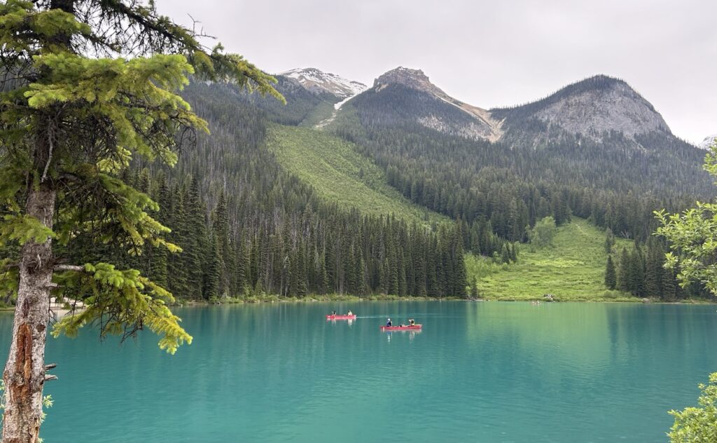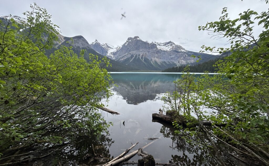 Driving up the mountain a bit further we reached Emerald Lake. It is less crowded and absolutely gorgeous. We parked along the access road and walked up to the lake entrance. But instead of joining people there we took the Emerald Lake loop trail that starts right before the canoe rental. This trail took us through the woods and along the Peaceful Pond until we got right to the lake‘s edge. Just a few hikers crossed our path and you have fantastic views of the lake. We did not have enough time to complete the two hour loop but doubled back after about a kilometer and after a quick photo stop at the lodge went back to our car.
