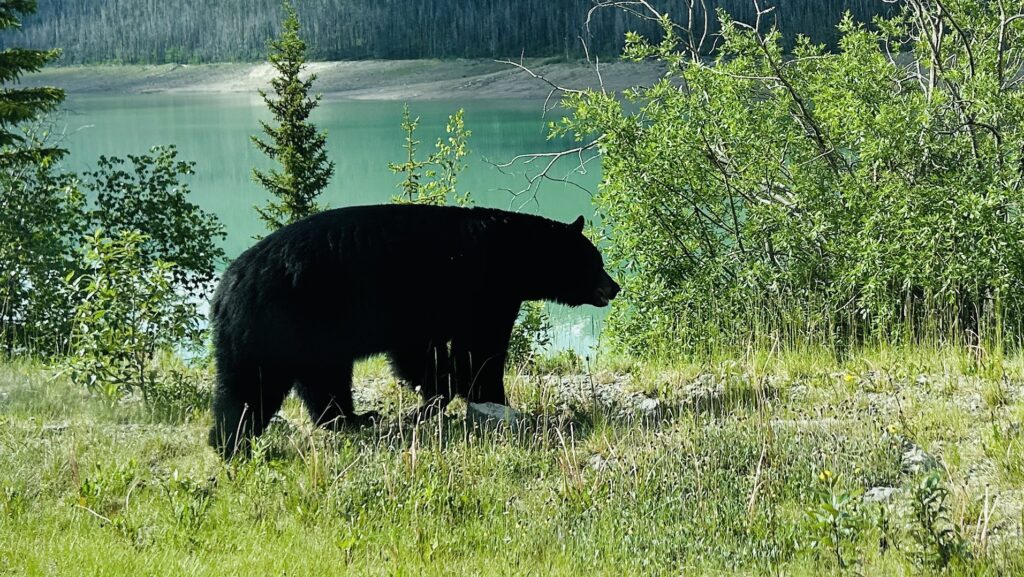 On our way up the mountain to Maligne Lake we drove past Medicine Lake without stopping. But when we saw several cars halted in the middle of the road we knew that we had encountered more wildlife in the area. Indeed, a black bear was crossing the road between the cars. It walked right past my car window.